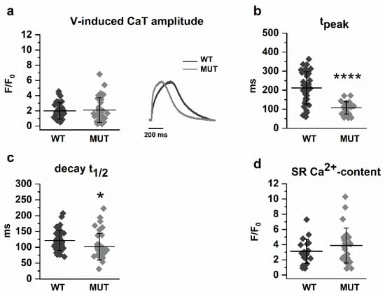 Parameters of V-induced CaT and SR Ca2+-content in WT and MUT. (a) CaT amplitude (WT n = 37, MUT n = 32); (b) CaT tpeak (WT n = 37, MUT n = 32); (c) CaT decay t1/2 (WT n = 43, MUT n = 36); (d) amplitude of caffeine-induced Ca2+ transients, reflective of SR Ca2+-content (WT n = 20, MUT n = 27); Data are expressed as mean ± SD; * p < 0.05 and **** p < 0.0001 vs. MUT.