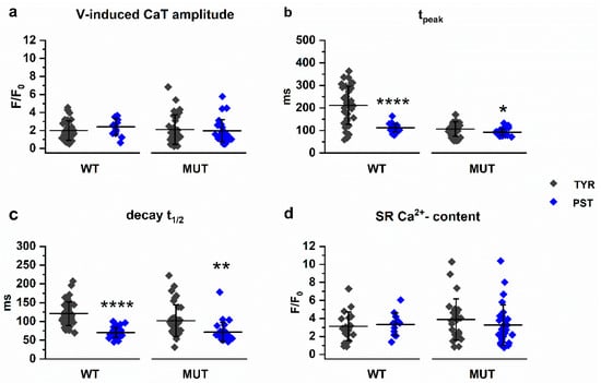 PST3093 1µM (PST) effect on V-induced CaT parameters and SR Ca2+-content in WT and MUT. (a) CaT amplitude in WT (TYR n = 37, PST n = 13) and MUT (TYR n = 32, PST n = 28); (b) tpeak in WT (TYR n = 37, PST n = 25) and MUT (TYR n = 32, PST n = 28); (c) Decay t1/2 in WT (TYR n = 43, PST n = 34) and MUT (TYR n = 36, PST n = 28); (d) SR Ca2+-content in WT (TYR n = 20, PST n = 12) and MUT (TYR n = 27, PST n = 28). Data are expressed as mean ± SD; * p < 0.05, ** p < 0.01, **** p < 0.0001 vs. TYR.