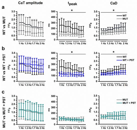 Rate-dependency of CaT parameters and CaD. Rate-dependency was tested by stepwise increments in pacing rate (1 Hz to 1.3 Hz, 1.7 Hz, and 2 Hz), the last 3 beats at steady-state are shown for each rate. (a) WT (black) vs. MUT (grey) in basal conditions (TYR; 9 ≤ n ≤ 15 for both groups); (b) PST3093 1µM (PST) effect in WT (TYR black, PST purple, 9 ≤ n ≤ 20); (c) PST effect in MUT (TYR grey, PST cyan; 9 ≤ n ≤ 20. Data are expressed as mean ± SD; * p < 0.05 for the interaction factor at two-way ANOVA.