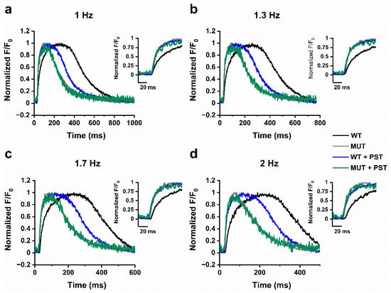 Rate-dependency of CaT profile in WT and MUT. Representative CaT profiles for WT and MUT in basal conditions and in presence of PST3093 1 µM (PST) at pacing rates of 1 Hz (a), 1.3 Hz (b), 1.7 Hz (c), and 2 Hz (d). The rising phase of CaT is shown at a faster time scale in the inset of each panel.