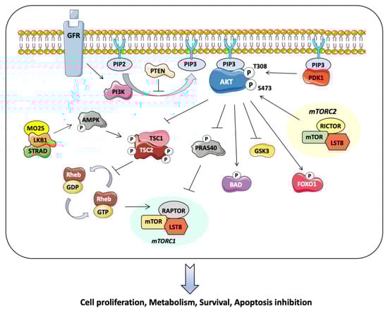 The Pi3K/AKT/PTEN/mTOR pathway is activated by several growth factor receptors, including HER2, fibroblast growth factor receptor 1 (FGFR1), and insulin-like growth factor 1 (IGF1R). In addition, estrogen has also been shown to activate PI3K/AKT signaling by a direct binding of cytoplasmic ERα to PI3K and Src. This occurs following ERα methylation on the arginine 260 residue by PRMT1, another member of the arginine methyltransferase family performing asymmetric demethylation [23]. Interestingly, ERα/Src and ERα/PI3K interactions are correlated with the activation of the downstream effector AKT in a subset of breast tumors. Survival analysis revealed that high expression of the ERα/PI3K/Src complex is an independent marker of poor prognosis and associated with reduced disease-free survival [24,25]. This methylation event also plays a crucial role in IGF1 signaling, as PRMT1 impairs IGF1R binding to ERα and downstream AKT signaling [26]. Mechanistically, activated PI3K catalyzes the conversion of PIP2 into the second messenger PIP3. The recruitment to the plasma membrane of AKT and PDK1 by PIP3 leads to the double phosphorylation of AKT on the kinase domain and the regulatory domain by the mTOR complex. The activation of AKT ultimately leads to the phosphorylation of a large number of targets, such as tuberos sclerosis complex 2 (TSC2), glycogen synthase kinase-3β (GSK3β), and the transcription factors of the forkhead box, class O (FOXO) involved in cell proliferation, metabolism, and survival [27] (Figure 1). Activation of the TSC2 complex leads to the inhibition of pro-apoptotic proteins and signals with the dissociation of the TSC1-TSC2 complex; such a dissociation ultimately activates TORC1, resulting in the inhibition of autophagy [11]. With regard to pro-apoptotic signals, including FOXO transcription factors, they are inactivated by AKT through their nuclear exclusion, resulting in cell cycle progression. In parallel, the extrinsic apoptotic pathway involving Fas Ligand (FasL) and TNF-related apoptosis-inducing ligand (TRAIL) is also inhibited [28,29]. Actors of the PI3K/AKT/PTEN/mTOR pathway with the central role of AKT are depicted in Figure 1.