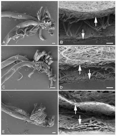Spinning apparatus of last instar larvae without FGs and cross sections of their loose cocoons. (A,B) The cecropia silk moth, Hyalophora cecropia. (C,D) The ailanthus silk moth, Samia cynthia. (E,F) The Atlas moth, Attacus atlas. Scale bars: (A,C,E) = 100 µm; (B,D,F) = 200 µm. Abbreviations: silk glands (sg), silk press of the spinning apparatus (spr), muscles (m). The arrows depict two distinct layers of the cocoon.