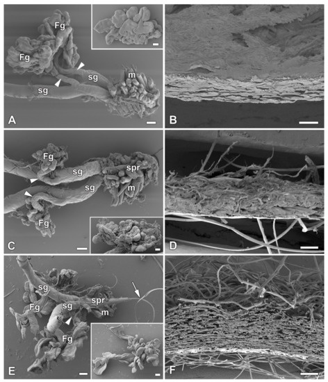 Spinning apparatus of last instar larvae with FGs and cross sections of their compact cocoons. (A,B) The Polyphemus moth, Antheraea polyphemus. (C,D) The Indian moon moth, Actias selene. (E,F) The commercial silkworm, Bombyx mori. Scale bars: (A,C,E) = 100 µm; (B,D,F) = 200 µm. Abbreviations: Filippi’s glands (Fg), silk glands (sg), silk press of the spinning apparatus (spr), muscles (m). The arrowheads indicate the ducts of the Filippi’s glands entering the lumen of the silk glands. The arrow points to the secreted silk fibre.