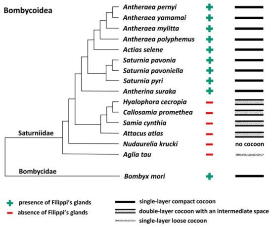 Phylogenetic tree of the superfamily Bombycoidea in relation to the presence/absence of FGs and the type of cocoon. The presence/absence of FGs is based on published data [3,16] and cocoon structure of A. mylitta, A. pernyi, A. yamamai, S. pavonia, S. pyri, and C. promethea was previously studied by Chen et al. [19]. The types of cocoons of the other species in this study are indicated in Figure 1 and Figure 2 and Figure S1 in the Supplementary Materials. The phylogenetic tree was based on Chen et al. [20] and Hamilton et al. [22].