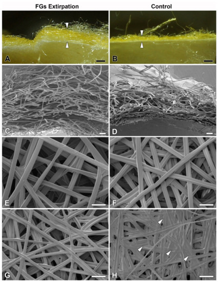However, when we compared the cocoon architecture between the operated and control animals, we found a striking difference in the compactness and thickness of the cocoon wall structure. In the cocoons of the operated animals, the silk layers were loosely arranged compared to the very dense structure of the layers in the cocoons of the control animals (Figure 4). These differences were observed at the level of light microscopy (Figure 4A,B). Even more convincing evidence for these structural differences was provided by scanning electron microscopy (SEM) examination (Figure 4C,D). High-resolution SEM images of the outer and inner sides of the cocoon wall revealed striking differences in the arrangement of silk fibers. On both sides, cocoons from animals with extirpated FGs exhibited a much looser arrangement (Figure 4E–H). The most striking differences were observed on the inner side, where the cocoons of operated animals had a significantly lower coverage with sericins than the cocoons of control animals, where sericin covered a considerable part of the surface (Figure 4G,H).