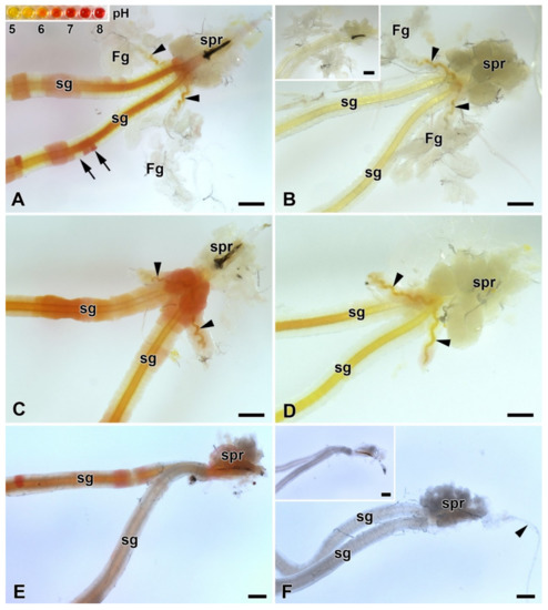 Previous studies performing comparative transcriptome analysis have shown that FGs contain many different transcripts of genes encoding ion channels and inorganic and organic ion carriers. Previous results therefore suggest that FGs may regulate ion flux and thus influence pH changes in forming silk fibers within ASGs. It was hypothesized that physical properties such as viscosity and adhesion of silk fibers may be affected by pH changes [13,28,29,30]. However, our experiments with the pH-indicating phenol red dye contradict this hypothesis, as we did not observe significant changes in pH lin the silk material within ASGs between individuals with extirpated FGs and intact control individuals. Thus, either the FGs have no effect on the pH of the silk material in the ASGs or there are only minor changes that are below the resolution limits of the phenol red method used. However, we found that the pH of some epithelial cell clusters of the SGs changed significantly and thus the SGs themselves can regulate the pH of the silk material in the ASGs.