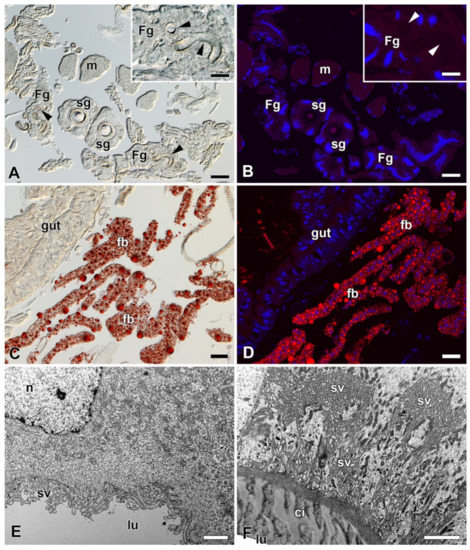 Detection of fat in the FGs and SGs of B. mori. (A) Brightfield micrograph of a cross section of FGs and SGs stained with Oil Red O dye for the presence of fat granules. No positive signal is visible. Arrowheads show the ducts of the FGs. Inset: A higher magnification of the FG. Arrowheads show the duct of the FG. (B) The same section as in (A) shown under a fluorescence microscope. No fat granules were detected with Oil Red O staining. The cell nuclei (blue) were counterstained with DAPI. (C) A section through an anterior part of the larval abdomen stained with Oil Red O dye showing the fat granules in the perivisceral fat body lobes. (D) The same as in (C) under a fluorescent microscope. Fat granules stained with Oil Red O are clearly visible in the fat body lobes. Blue, cell nuclei stained with DAPI. (E) A transmission electron micrograph of a secretory cell from the FGs. No fat granules are found in the cytoplasm of the cell. (F) A transmission electron micrograph of an epithelial cell from the SG. No lipid granules are found in the cell cytoplasm. Scale bars: (A–D) = 25 µm; insets in (A,B) = 25 µm; (E,F) = 1 µm. Abbreviations: Cuticular intima (ci), fat body (fb), Filippi’s glands (Fg), midgut epithelium (gut), lumen of FGs and SG duct (lu), muscles of silk press (m), nucleus (n), silk glands (sg), secretory vesicles (sv).