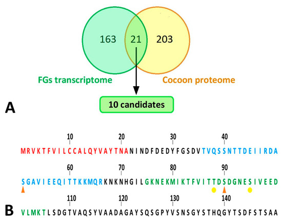 Bioinformatic analyses of silk proteins. (A) Comparison of results of proteomic analysis with published transcriptomic data. Yellow circle: all peptides detected by peptide mass fingerprinting; green circle: differentially expressed genes in the FG-enriched sample of wandering larvae spinnerets as published in Wang et al. [13]. The cut set contained a total of 21 proteins (18 of which were upregulated, 3 downregulated in FG-enriched transcriptome). This list of proteins was further narrowed down to 10 candidates (highlighted in green), which are listed in Table 1. (B) N-terminal part of B. mori FibH. Features indicated by letter colors: red—signal sequence; blue—peptide with significantly lower phosphorylation in larvae with ablated FGs; green—sequence not detected in FG-ablated larvae but containing phosphorylation in control larvae. Phosphorylation sites: orange arrowhead—major; yellow dot—minor.