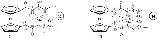 Using the first approach, our group has made serious efforts in the synthesis and conformational analysis of ferrocene-containing peptidomimetics [,,,,,,,]. Due to the distance between the cyclopentadienyl (Cp) rings of 3.3 Å, the peptide chains when attached to the 1,1′-disubstituted ferrocene templates, i.e., -NH-Fn-CO- and -NH-Fn-NH- (Fn = ferrocenylene), come close enough to form 12- (I) [,,,,,] and 14-membered interstrand hydrogen-bonded rings (II) [,], respectively, in symmetrically disubstituted ferrocene peptides (Figure 1). We have therefore shown that 1,1′-disubstituted ferrocenes are capable to nucleate β-turns and β-sheet-like structures upon conjugation with amino acids and short peptides.
