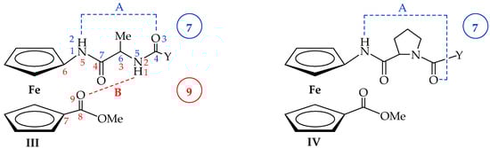 To investigate whether the asymmetrically disubstituted ferrocene conjugates with amino acids are involved in hydrogen-bonded turns, we first prepared the conjugates of methyl 1′-aminoferrocene-carboxylate with Ala (III) [] and Pro (IV) [] (Figure 2). Detailed spectroscopic analysis revealed two different conformational patterns consisting of seven-membered intra- (A, γ-turn) and nine-membered interstrand hydrogen bonded rings (B) in the Ala-dipeptides III, whereas the Pro-dipeptides IV adopted pattern A only. It was found that the different bulkiness and basicity of the Boc and Ac group affected the hydrogen-bonding patterns to some extent.