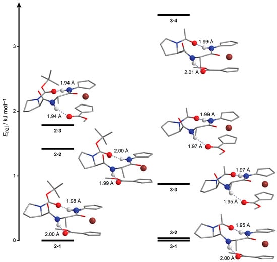 The reported conformations differ from those determined by the computational study, although β-turn prevails in heterochiral derivative 2. However, the energy penalty connected with a reorganization of the individual molecule from the most stable conformer (as determined by computational study) to less stable conformation (as determined by X-ray analysis) is usually overcome by favourable intermolecular interactions that additionally stabilize molecules in crystal [].