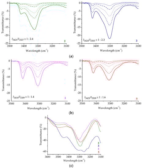Our next goal was to connect the results of the computational analysis with experimental data, especially with the determined HB patterns predicted by DFT in peptides 2–5. HBs have a significant effect on the IR spectrum causing a red shift and increase in the intensity of the X–H stretching frequency when X–H∙∙∙Y hydrogen bonds are formed [,]. Therefore, a closer look at the amide A region in the IR spectra of the studied compounds revealed the presence of free (~3420 cm−1) and associated (~3300–3325 cm−1) NH groups, and the red-shifted stretching frequencies of the COAc/Boc groups strongly suggest their participation in HBs [] (Figure 6a,b and Figures S12, S24, S36 and S48 in Supplementary Materials). The ratios of free and associated NH bands in homochiral peptides 4 and 5 (~1:1.5) (Figure 6b) and heterochiral peptides 2 and 3 (~1:2.4) (Figure 6a) suggest a higher extent of hydrogen bonding in heterochiral conjugates. The intramolecular nature of the hydrogen bonds was proved by the concentration-independent IR spectra (Figure 6a,b). Otherwise, the concentration dependence of the IR spectra, i.e., the decrease in the intensities of intermolecularly engaged NH groups would be observed upon dilution. The domination of associated NH groups was also observed in the solid state of compounds 2–5 (Figure 6c and Figures S13, S25, S37 and S49 in Supplementary Materials).