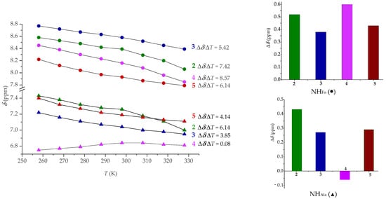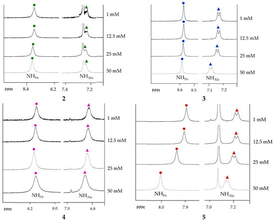 Next, concentration-, temperature- and solvent-dependent NMR spectroscopy was performed to obtain further details about the conformational space of the tested conjugates. NHFn and NHAla showed no significant upfield shifts (δ < 0.1 ppm) at high (50 mM) vs. low concentrations (1 mM) (Figure 7), supporting their involvement in IHBs, as suggested by the concentration-independent IR data (Figure 6a,b).