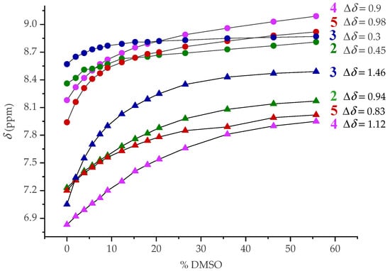 The chemical shifts of the four NHFn and four NHAla showed different variations upon titration of CDCl3 solution with DMSO-d6 (Figure 9). Although these protons are involved in IHBs, they showed downfield shift with increasing DMSO content, which could be due to exposure to the hydrogen-bond-accepting solvent. The NHAla of the tested peptides showed a high degree of solvent sensitivity (Δδ ~ 0.94–1.46 ppm), which is probably due to their involvement in weak HBs. However, increasing the DMSO content from 0–56% affected the NHFn of heterochiral peptides 2 and 3 much less (Δδ ~ 0.3–0.45 ppm) than those of homochiral peptides 4 and 5 (Δδ ~ 1 ppm), indicating their involvement in stronger IHBs and folding into more stable turn structures.