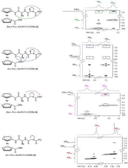 Due to the hydrogen bonding deshielding, the resonances of the involved amide protons are downfield shifted (δ > 7 ppm), and the higher values of the chemical shifts indicate stronger hydrogen bonding []. Since the NHFn resonances of the tested peptides are significantly downfield shifted (δ ~ 8–8.6 ppm) compared to NHAla (δ ~ 6.9–7.2 ppm), their participation in stronger HBs is suggested (Figure 7, Figures S4, S16, S28 and S40 in Supplementary Materials).