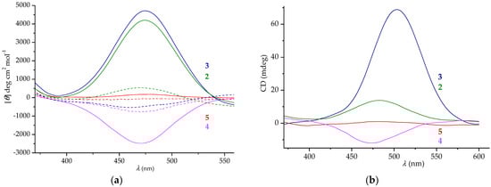 The CD silent ferrocene region in the spectrum of homochiral peptide 5 (Figure 11) confirms the absence of chiral order predicted by NMR. Since conformational analysis indicated the presence of the folded structures in peptides 2–4, they were expected to show CD activity, but with different sign depending on their homo-or heterochirality. The negative Cotton effect (Mθ ~ 2500 deg cm2 dmol−1) for homochiral peptide 4 indicated M-helicity, whereas heterochiral peptides 2 and 3 showed almost 2-fold stronger positive Cotton effects (Mθ ~ 4200–4800 deg cm2 dmol−1) related to P-helicity of the ferrocene core (Figure 11a). These findings are in the agreement with the computational study. The most stable conformers of 2 and 3 have a significant contribution of the P-1,2′ helical conformations (Table S1 in Supplementary Materials) in the total population, thus resulting with a positive Cotton effect. However, M-1,1′ helical structures were determined to be the most abundant in derivatives 4 and 5, especially in derivative 5 where all of the most stable conformers adopt this type of helicity. Smaller values of the pseudotorsion angles (due to 1,1′ relative orientation of the substituents on the opposite Cp rings) will result with a smaller intensity in CD spectrum. However, the conformers M-1,2′ that coexist in 4 will additionally enhance the negative Cotton effect.