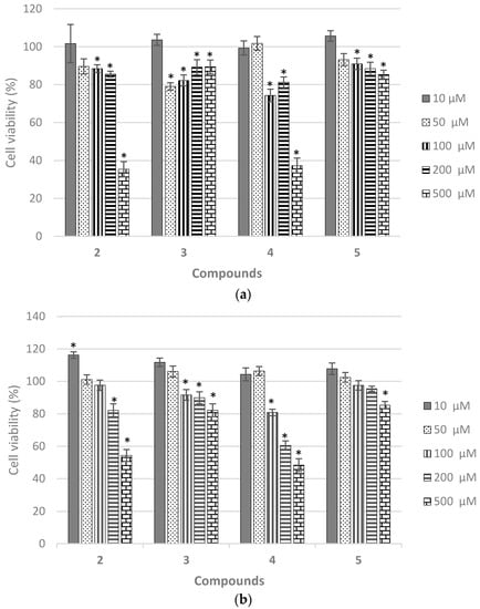 A further step after the successful synthesis and characterization of the investigated peptidomimetics is the determination of their biological activity. Based on the literature data and our previously published work [,], peptidomimetics 2–5 are expected to possess antiproliferative and/or antitumor activity. Therefore, the biological activity of 2–5 was evaluated based on their ability to inhibit the growth of MCF-7 and HeLa carcinoma cells. The cytotoxicity of the synthesized compounds was measured using the CellTiter 96® AQueous One Solution Cell Proliferation Assay. Results are expressed as cell viability (%) of treated cells versus control, non-treated cells and shown in Figure 13a,b.