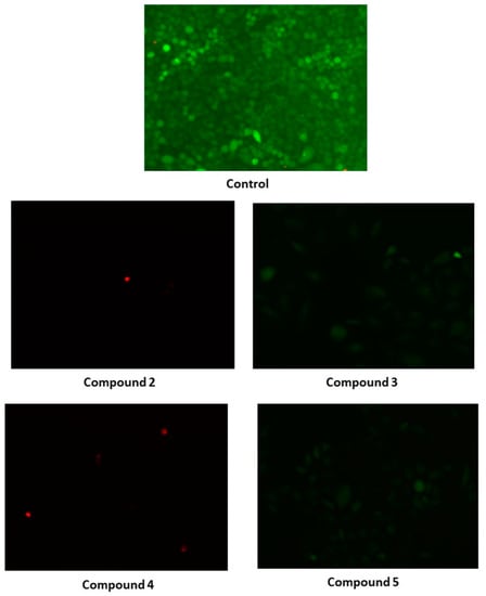 The observed cytotoxicity of the tested peptidomimetics could be the result of their impact on two basic cell processes, cell division and/or cell death. Programmed cell death through the process of apoptosis was originally defined based on morphological characteristics, so the initial identification of apoptotic cells is often observed under the microscope. Control and treated HeLa cells were stained with the fluorescent dyes fluorescein diacetate (FDA) and propidium iodide (PI), examined, and photographed under the EVOS FLoid Cell Imaging Station fluorescence microscope, as shown in Figure 14.