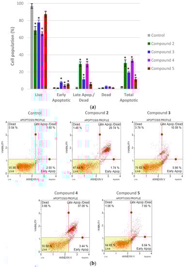 The use of FDA and PI fluorescent stain allows differentiation between living, necrotic, and apoptotic cells in the sample of treated cells. In a photograph of control HeLa cells, there are plenty of live, green-stained cells, whereas in the case of HeLa cells treated with compounds 2 and 4, respectively, only a few dead cells stained red can be seen (Figure 14). To further confirm and quantify the observed morphological changes indicative of the induction of cell death during treatment with the tested peptides 2–5, flow cytometry analysis was conducted using the Muse® Cell Analyser and the Muse™ Annexin V & Dead Cell Kit. The results of this analysis for HeLa cells are shown in Figure 15.