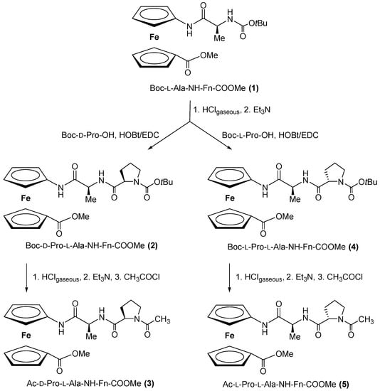In 2018, Moriuchi et al. gave a review of previously synthesized symmetrically disubstituted ferrocene-dipeptide conjugates that adopt β- and γ-turn-like structures [].
