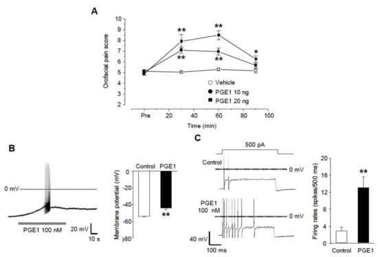 2.1. PGE1 Induces Mechanical Allodynia and Enhances the Excitability of TG Neurons