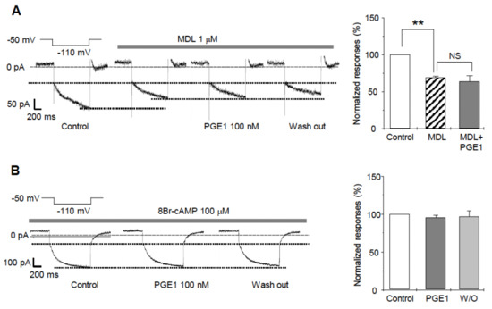 The effects of adenylyl cyclase inhibitor (MDL12330A) and 8Br-cAMP on PGE1-induced Ih facilitation. (A) A representative recording of Ih current after application of PGE1 (100 nM) in the presence of adenylyl cyclase inhibitor (MDL-12330A hydrochloride, 1 µM). Summary for the effects of PGE1 on Ih in the presence of MDL. Ih was significantly inhibited by MDL and was not facilitated by PGE1 after the application of MDL. (B) A representative recording of Ih after application of PGE1 (100 nM) in the presence of 8-Br-cAMP in the pipette solution. Summary for the effects of PGE1 on Ih in the presence of 8-Br-cAMP. Results are presented as the mean ± SEM (** p < 0.001, paired t-test). MDL: MDL-12330A, NS; not significant.