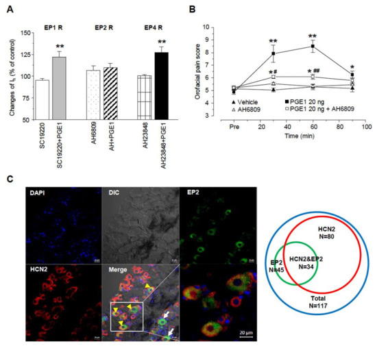 To investigate which EP receptor is responsible for the facilitation of Ih by PGE1, we used EP1, EP2, and EP 4 receptor antagonists (SC19220, AH6809, and AH23848, respectively), and the EP3 receptor leading the decreases in cAMP was not tested (Figure 6A). Each specific EP receptor antagonist alone did not have an effect on inward Ih currents. Facilitation of Ih by PGE1 was not altered by SC19220 or AH6809 (122.1 ± 6.2% and 127.4 ± 6.3%, respectively; n = 5), while AH6809 significantly inhibited the facilitation of Ih by PGE1 (108.3 ± 5.2%, n = 5, p = 0.25). These results suggest that the facilitation of Ih by PGE1 is mediated by adenylyl cyclase and cAMP via the EP2 receptor. Next, we tested whether activation of the EP2 receptor by PGE1 was involved in orofacial pain. AH6809 (10 μg/10 μL per site) was injected simultaneously with PGE1 (20 ng), and the orofacial pain response was observed over 90 min (n = 6, Figure 6B). The increased orofacial pain score by PGE1 (30~60 min) was significantly reduced to 12.2 ± 0.2% from 16.4 ± 0.9% after application of AH6809, which (10.9 ± 0.1%) did not show any difference from the control group (10.3 ± 0.2%). Finally, we investigated the protein expression of the EP2 receptor and the HCN2 channel in the TG using immunohistochemistry (Figure 6C). The EP2 receptor and HCN2 channel were expressed in 38.5% (n = 45) and 68.3% (n = 80) of TG neurons (n = 117), respectively. In 29.1% of TG neurons, co-localization of the EP2 receptor and the HCN2 channel was observed, which accounted for 75.6% of EP2 receptor-positive TG neurons. Taken together, these results suggest that HCN2 channel expression in EP2 receptor-positive TG neurons plays an essential role in PGE1-induced orofacial pain and is mediated by activation of the EP2 receptor.