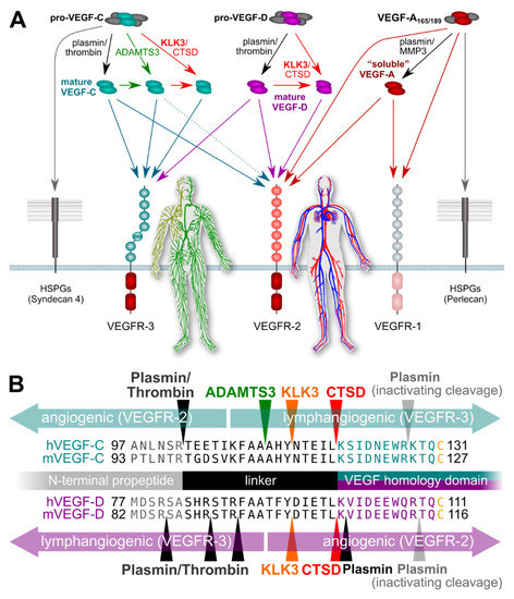 Simplified schematic of the proteolytic processing of VEGFs. (A) In vitro data on the properties of different forms of mature VEGF-C and VEGF-D predict that KLK3 promotes lymphangiogenesis in tumors overexpressing VEGF-C, but angiogenesis in tumors overexpressing VEGF-D. Lymphangiogenesis is mediated via VEGFR-3, and progressive proteolytic processing renders VEGF-C selective for VEGFR-3. Unlike VEGF-C, VEGF-D can become exclusively angiogenic upon proteolytic processing [75]. VEGF-C- and VEGF-D mediated lymphangiogenesis could enhance tumor immune surveillance during the early stages of tumor development but promote metastasis (VEGF-C) or tumor angiogenesis (VEGF-D) during later stages. In the absence of proteolytic processing, the longer isoforms of VEGF-A, pro-VEGF-D and pro-VEGF-C are sequestered on cell surface heparan sulfate proteolglycans (HSPGs) and in the extracellular matrix. (B) The locations of proteolytic processing for proteases known to cleave VEGF-C and/or VEGF-D. Note that the processing sites for plasmin and thrombin for VEGF-D have not been experimentally determined and are only predicted based on the known cleavage specificities.