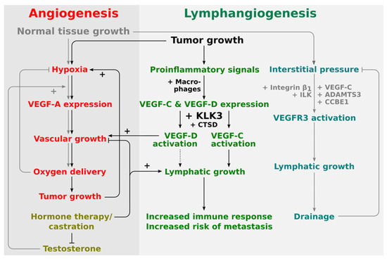 Androgen deprivation therapy does seem to induce lymphangiogenesis in prostate cancer and, thus, could contribute to lymphatic metastasis [106] as well as to an increased immune response [48]. It is unclear how this effect is mediated and whether it is relevant for the development of aggressive CRPC. In experimental prostate tumors, tumor cells themselves have been shown to be the source of lymphangiogenic growth factors [107], but in clinical diseases, including ocular neovascularization and cervical cancer, infiltrating macrophages appear to be a major source of VEGF-C and VEGF-D [108,109]. This may as well be the case for prostate cancer [110]. In mice, VEGF-C levels decrease and VEGF-D levels increase after castration [104], rendering the net effect of angiogenesis versus lymphangiogenesis dependent on the proteases that are available for activation. Vice versa, stimulation by estradiol results in the upregulation of key lymphatic signaling molecules such as VEGF-D, VEGFR-3, and Lyve-1, while blocking estrogen receptor alpha (ER⍺) by tamoxifen leads to lymphatic degeneration [111].