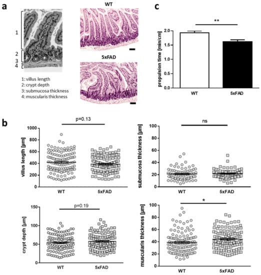 2.1. Differences in Gut Anatomy and Function Driven by FAD Mutations in a Mouse Model of Alzheimer’s Disease