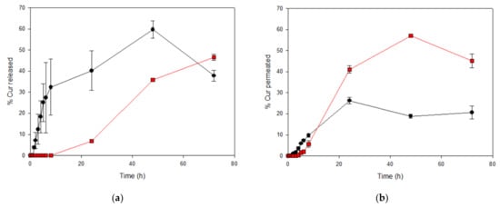 The optimized hydrogel was then assessed in terms of in vitro Curcumin release and permeation. As comparison, a solution of GR CurEpiβCD was prepared following the same procedure as described in Section 4.7. As previous results showed (Table 2), the percentage of Curcumin released and permeated after 6 h from the hydrogels in the optimization step, indicating slow processes. For that reason, in this section, both studies were performed over the course of 72 h.