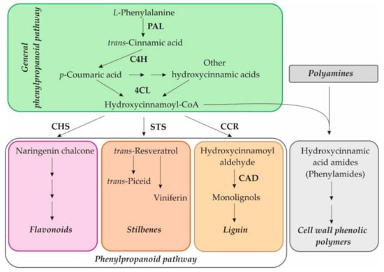 Scheme of the phenylpropanoid pathway and connection to the phenylamide metabolism. PAL, phenylalanine ammonia-lyase; C4H, cinnamate-4-hydroxylase; 4CL, 4-coumarate:CoA ligase; CHS, chalcone synthase; STS, stilbene synthase; CCR, cinnamoyl-CoA reductase; CAD, cinnamyl alcohol dehydrogenase.