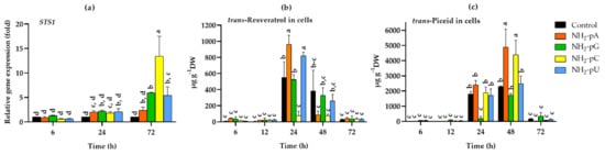 Expression of stilbene synthase gene (STS1) and accumulation of stilbenes in cells of Vitis vinifera cv. Monastrell treated with 5 µM nucleoside 5′-phosphoramidates. (a) STS1, stilbene synthase; (b) accumulation of trans-resveratrol; (c) accumulation of trans-piceid. Total RNA was reverse-transcribed into cDNA and used as a template for real-time quantification PCR reaction as described in the Section 4. Specific primers were designed for STS1 and EFα1 (elongation factor 1-alpha, which was used as an endogenous control). The expression level of STS1 in the control cells (no nucleotide added) was set to 1. Values represent the mean ± standard deviation of the three replicates. Accumulation of trans-resveratrol and trans-piceid was determined using the HPLC method as described in the Section 4. Values without a common letter are significantly different according to ANOVA and Tukey’s HSD multiple range test (p ≤ 0.05).