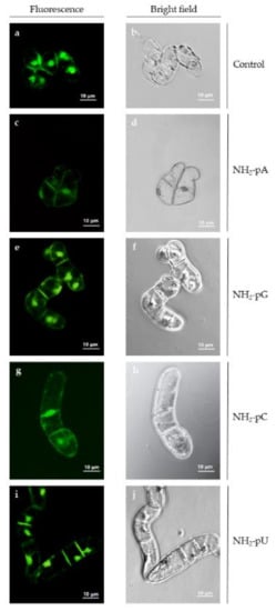 Viability of Vitis vinifera cell suspension culture treated with 5 µM NH2-pNs at 72 h. It was evaluated by incubating cells in the presence or absence of the indicated nucleotide for 1–2 min in fresh Gamborg medium using the Plant Cell Viability Assay Kit (Sigma-Aldrich, Burlington, MA, USA) as described in the Section 4. Fluorescence was observed with an AxioVert 200 Carl Zeiss microscope using a Zeiss filter (FS09 exc = 495 nm, emi = 517 nm). (a,b) control cells; (c,d) cells treated with NH2-pA; (e) and (f) NH2-pG; (g,h) NH2-pC; (i,j) NH2-pU. The left-hand column shows cells under the fluorescence microscope, and the right-hand column shows cells under the bright field microscope. No red fluorescence, which indicates cell damage or mortality (FS15 exc = 538 nm, emi = 617 nm) was found (data not shown).