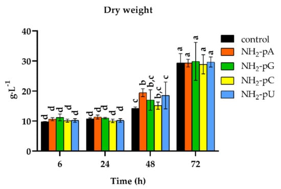 We also analyzed changes in the cell dry weight throughout the experiment. As shown in Figure 7, the nucleotide-treated cells displayed a similar biomass increase (from 10 to over 29 g DW L−1), and therefore cell growth as the control (i.e., untreated cells).