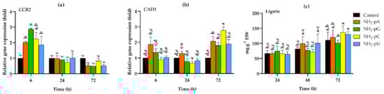 We tested both the expression of genes involved in lignin biosynthesis and the accumulation of lignin, one of the main products of the phenylpropanoid pathway. CCR2 gene encodes cinnamoyl-CoA reductase, which is the first step in monolignol biosynthesis. As can be seen in Figure 8a, the expression of CCR2 was induced by nucleotides only at 6 h of treatment, and for NH2-pU, NH2-pA, NH2-pC, and NH2-pG, it was 1.8-, 2-, 2.2- and 2.9-fold higher than in the control, respectively. Then, a reduced expression of CCR2 was observed, being at 72 h 2-fold lower in all nucleotide treatments than in the control (i.e., untreated cells) (Figure 8a).