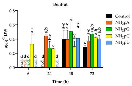 BenPut accumulation in cells of Vitis vinifera treated with 5 µM nucleoside 5′-phosphoramidates. Values represent the mean ± standard deviation of the three replicates. Values without a common letter were significantly different according to ANOVA and Tukey’s HSD multiple range test (p ≤ 0.05). n.d., not detected.