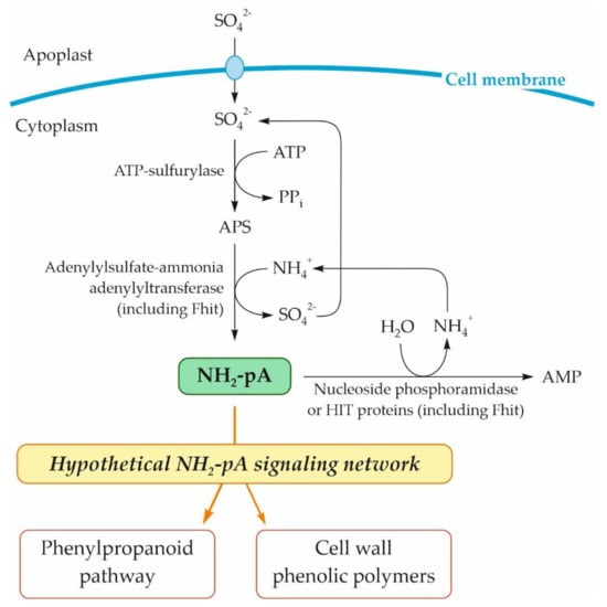 Although it is not known whether any of the NH2-pNs accumulates in response to environmental stresses, according to our earlier observation of the induction of the phenylpropanoid pathway in Arabidopsis thaliana seedlings by NH2-pA [4], it seems plausible that biotic and abiotic environmental factors do affect the accumulation of this nucleotide, the putative regulatory molecule. The signaling transduction pathways underlying both abiotic and biotic stresses mediating the regulation of cellular responses are still intensively studied by many researchers. One of the defense strategies in higher plants under abiotic and biotic stresses is an activation of the phenylpropanoid pathway [22]. This pathway occurs widely in plant species, conferring adaptive advantages to diverse ecosystems. Its activation leads to the enhanced production of various phenylpropanoid compounds such as flavonoids [23,24], lignins [25], anthocyanins [26], salicylic acid [27], and stilbenes [28]. These metabolites reduce the adverse effects caused by stress-induced oxidative damage. One of the most studied stilbenes is trans-resveratrol. This compound is especially involved in plant–pathogen interactions [28] and plays an important role in plant responses to cadmium [29]. Besides the phenylpropanoid-based mechanism of plant responses to various biotic and abiotic stresses, another mechanism is the regulation of the ratio of S-containing compounds such as methionine, glutathione, phytochelatins, and glucosinolates by the activity of ATP-sulfurylase [30]. Through these S-compounds, that enzyme is involved in the plant tolerance of several biotic and abiotic stresses. For example, glutathione can control the gene expression of antioxidant enzymes such as superoxide dismutase or glutathione reductase as well as enzymes of the phenylpropanoid pathway (e.g., chalcone synthase and phenylalanine ammonia-lyase) under cadmium stress [31]. ATP-sulfurylase catalyzes the activation of SO42−, yielding high-energy adenosine-5′-phosphosulfate (APS) [30]. It is known that in plants, APS can be converted into NH2-pNs by ammonolysis catalyzed by adenylylsulfate-ammonia adenylyltransferase [9] and Fhit proteins [5]. Moreover, Fhit can degrade NH2-pA, releasing AMP and NH3 [7,10,15].