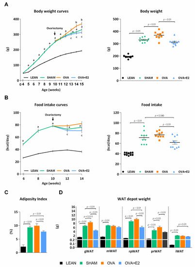 2.1. Effects of Ovariectomy and E2 Supplementation on Biometric Parameters and Blood Metabolic Profile