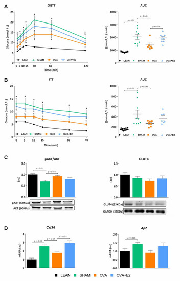 2.2. Effects of Ovariectomy and E2 Supplementation on WAT Insulin Pathway and Lipid Transporters