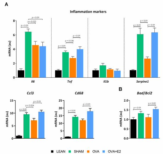 2.4. Effects of Ovariectomy and E2 Supplementation on Expression Levels of Adipokines and Markers of Apoptosis in WAT