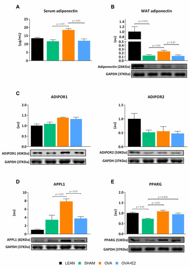 2.5. Effects of Ovariectomy and E2 Supplementation on the Expression of PPARG and Elements of Adiponectin Signaling Pathway in WAT
