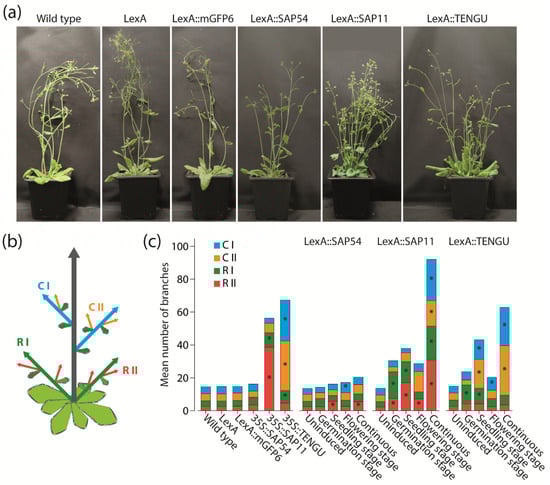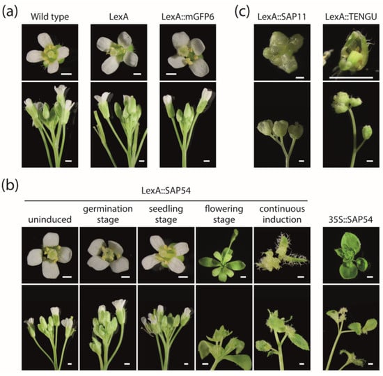 - MacLean, A.M.; Sugio, A.; Makarova, O.V.; Findlay, K.C.; Grieve, V.M.; Toth, R.; Nicolaisen, M.; Hogenhout, S.A. Phytoplasma effector SAP54 induces indeterminate leaf-like flower development in Arabidopsis plants. Plant Physiol. 2011, 157, 831–841. [Google Scholar] [CrossRef] [PubMed] [Green Version]