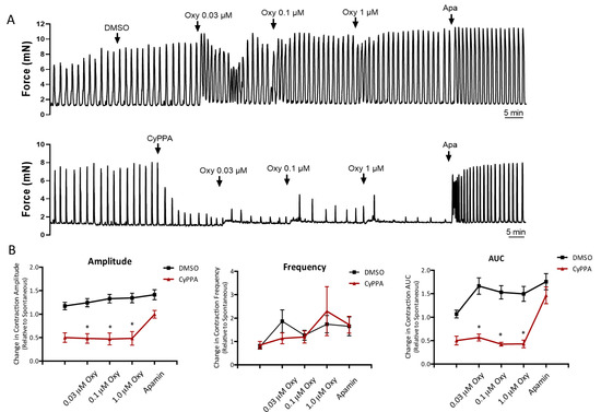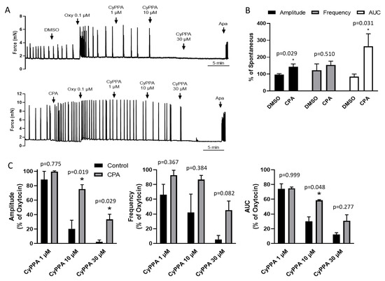 2.1. CyPPA Prevents Oxytocin Potentiation of Uterine Contractions