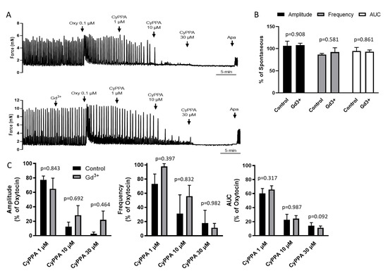 In addition to triggering internal store release, GPCR agonist stimulation can also increase Ca2+ influx from the extracellular environment. In particular, store-operated Ca2+ entry and second messenger mediated influx through plasma membrane nonselective cation channels (NSCCs) have been implicated in agonist responses [21]. To address the possible contribution of this Ca2+ source to the KCa2.3 dependent feedback, we pretreated uterine strips with 30 µM Gd3+ to block NSCC influx. Pretreatment with Gd3+ did not alter uterine contractions (Figure 3A,B) and although Gd3+ seemed to modestly impair CyPPA suppression of uterine contractions, this apparent effect did not reach statistical significance for the parameters evaluated (Figure 3C).