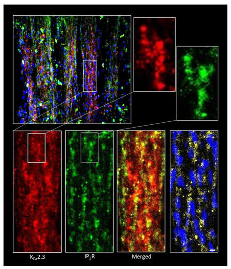 The implication of our functional data is that agonist-induced release of Ca2+ from the ER may provide preferential targeting of KCa2.3 channels to solicit negative feedback control of membrane potential and uterine contractions. This could be similar to the mechanism previously reported in the vascular endothelium, whereby IP3Rs on the ER membrane reside in close proximity to plasma membrane KCa channels and elicit membrane hyperpolarization during GPCR stimulation [19]. To investigate the possibility of preferential localization of IP3R with KCa2.3 channels within myometrial smooth muscle, thin sections of myometrium were removed from uterine strips and probed for KCa2.3 and IP3R expression via immunofluorescence. Immunostaining revealed densities and puncta of IP3R and KCa2.3 channels within longitudinal myometrial smooth muscle (Figure 4). Distinct overlapping densities of IP3Rs and KCa2.3 channels suggests substantial spatial clustering of these channels within confined cellular spaces (1–5 µm).