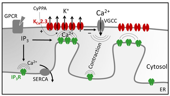 The peptide hormone oxytocin plays an important role in stimulating and coordinating uterine contractions at term. Although the uterus contracts primarily through regenerative pacemaker action potentials spreading through the myometrium, increased oxytocin release from the posterior pituitary in the later stages of gestation leads to higher circulating oxytocin levels and enhanced uterine contractions. During laboring contractions, binding of oxytocin to Gq-protein coupled receptors (GPCR) on the myometrium augments uterine contractility by soliciting additional increases in [Ca2+]i [16]. This mechanism involves GPCR-mediated elevation of intracellular inositol trisphosphate (IP3), which binds to IP3 receptors (IP3R) on the endoplasmic reticulum (ER) membrane to induce release of intracellular Ca2+ stores into the cytosol. It has become clear in recent years that spatially localized Ca2+ release from internal stores can target plasma membrane KCa channels and exert direct feedback regulation in various tissues [17,18,19]. Notably, these restricted signals can occur without altering global cellular [Ca2+]i. In vascular smooth muscle, this feedback regulation by the endoplasmic reticulum is an important controller of arterial tone [17,20], ultimately regulating blood pressure and flow.