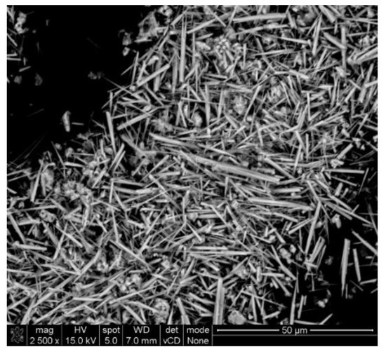 Triphasic calcium phosphates were obtained and used in the work as reinforcing filler of the porous PCL composites. As can be seen in the SEM image (Figure 1), the obtained filler was in the well-defined whiskers form. According to the data, ceramic particles in whiskers form improve the mechanical strength of polymer composites [23]. The length and width of the obtained whiskers were within the range of 10–30 μm and 1–3 μm, respectively, and the length-to-width ratio of the obtained whiskers was approximately 16.7.
