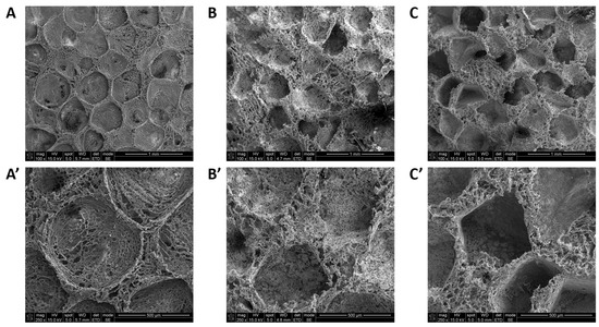 SEM images of scaffolds: (A,A’) 10% of PCL. (B,B’) 10% of PCL/HAP_50:50 w/w. (C,C’) 10% of PCL/HAP/Lys_50:48:2 w/w.
