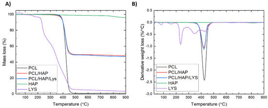 (A) Thermogravimetric curves of PCL-based foams. (B) First derivative of the TGA curves of PCL-based foams.